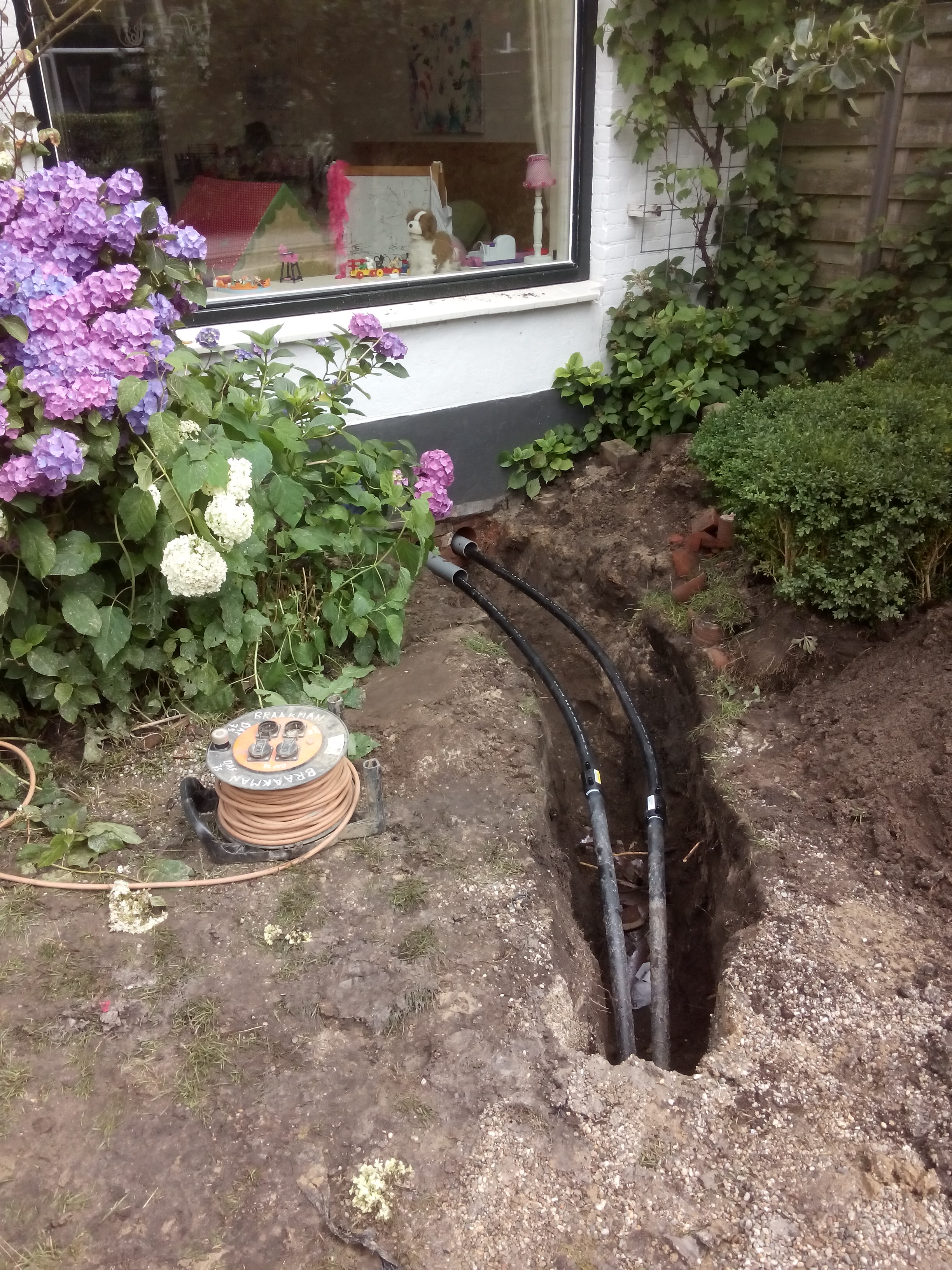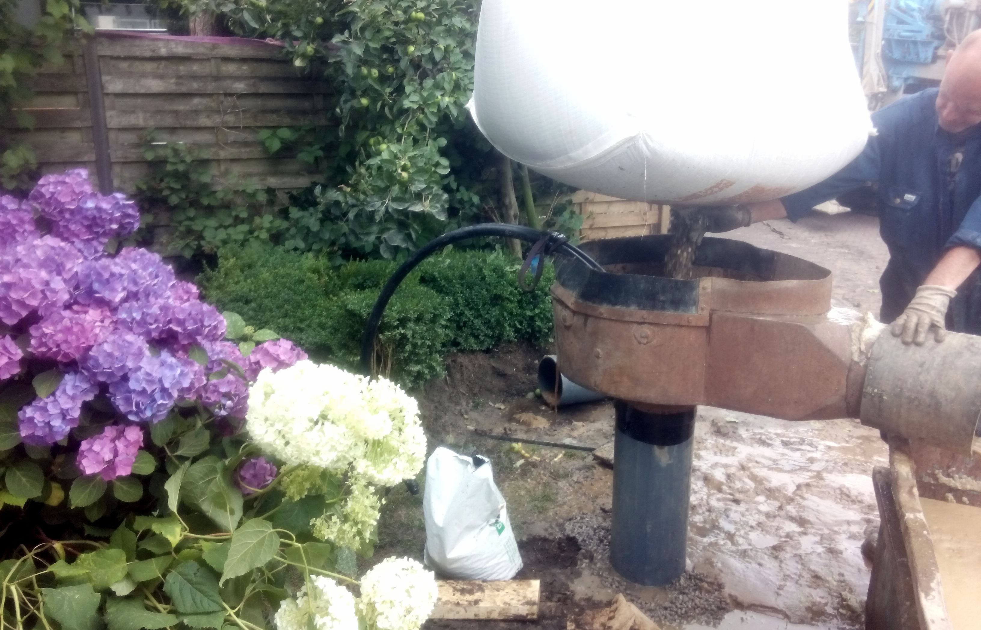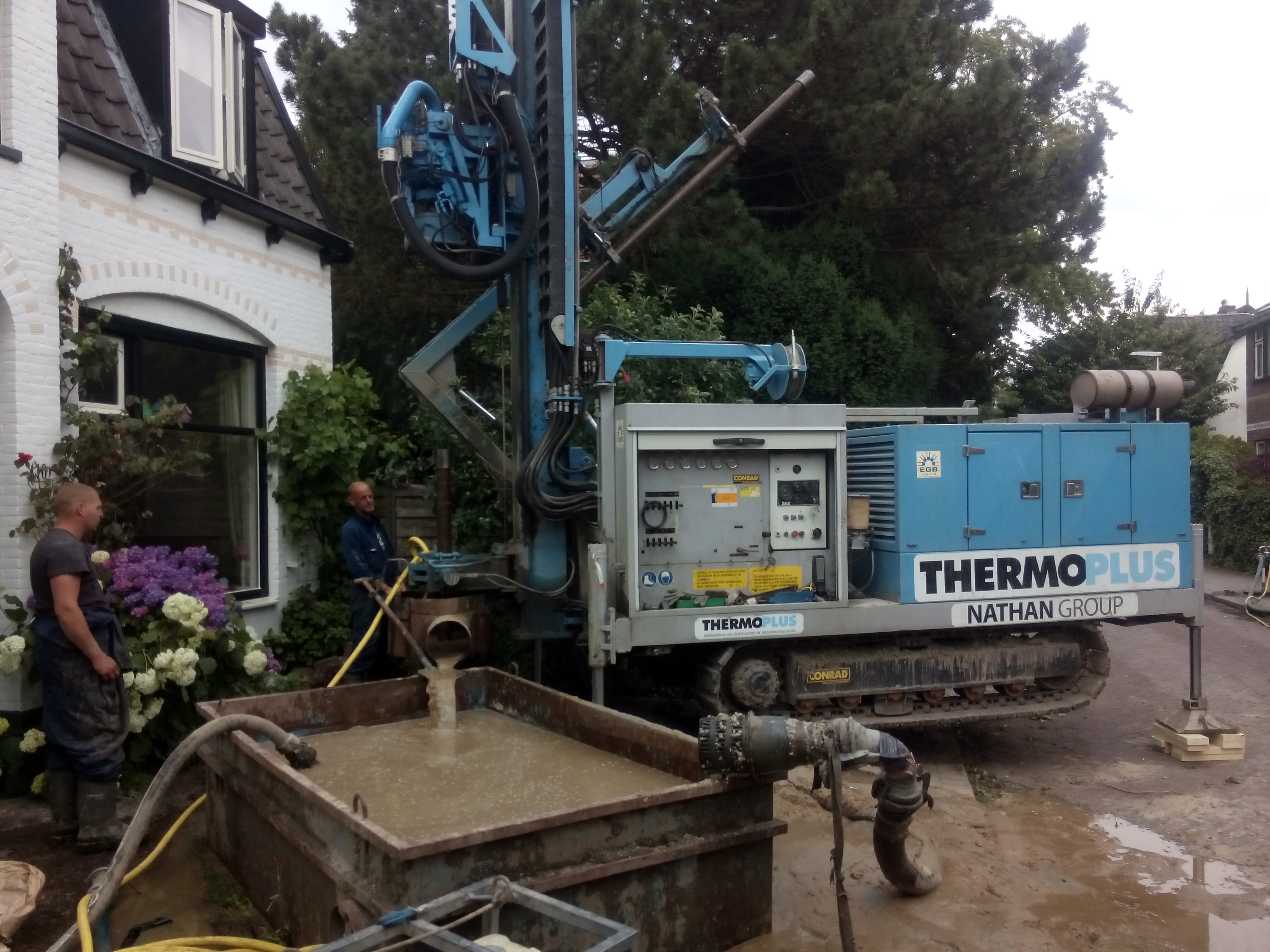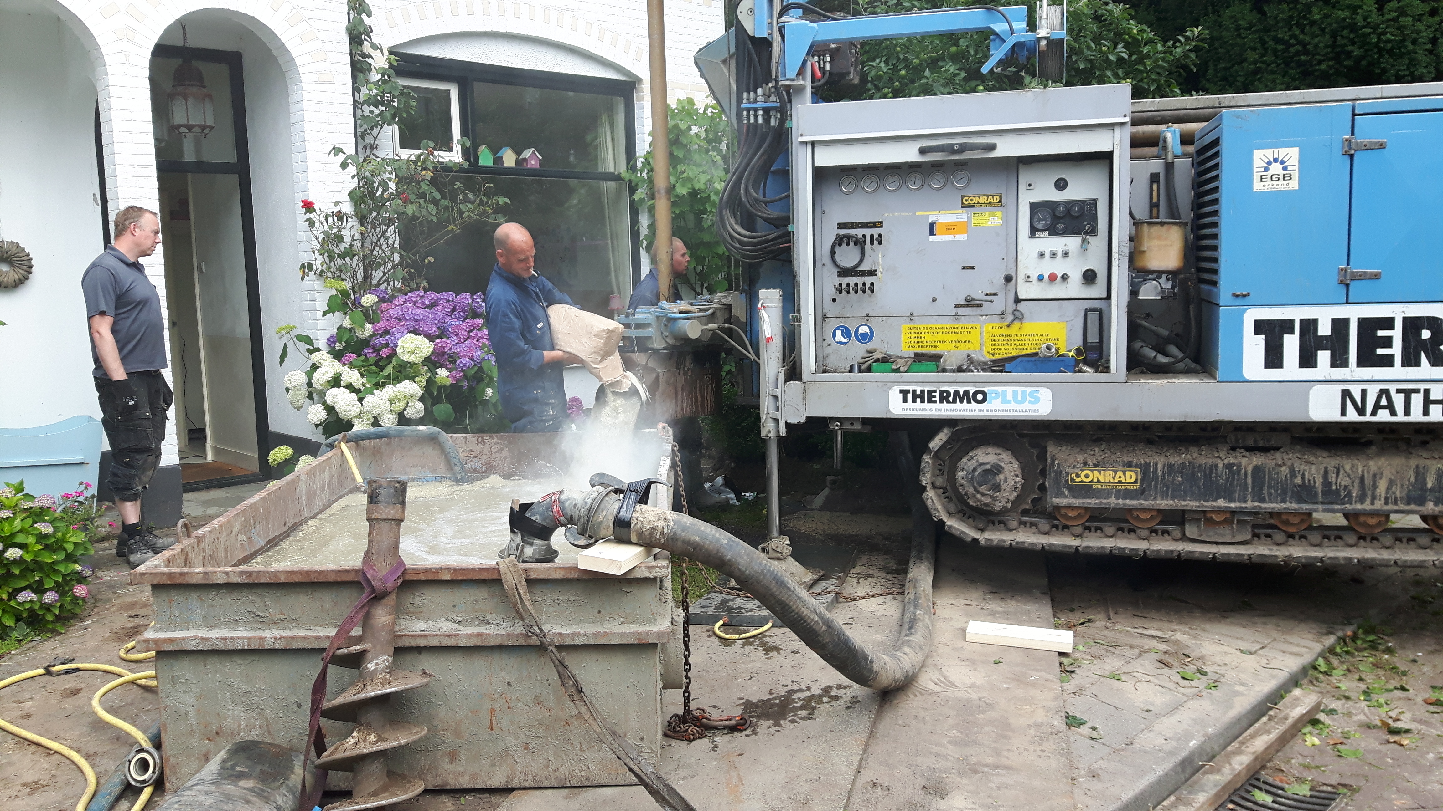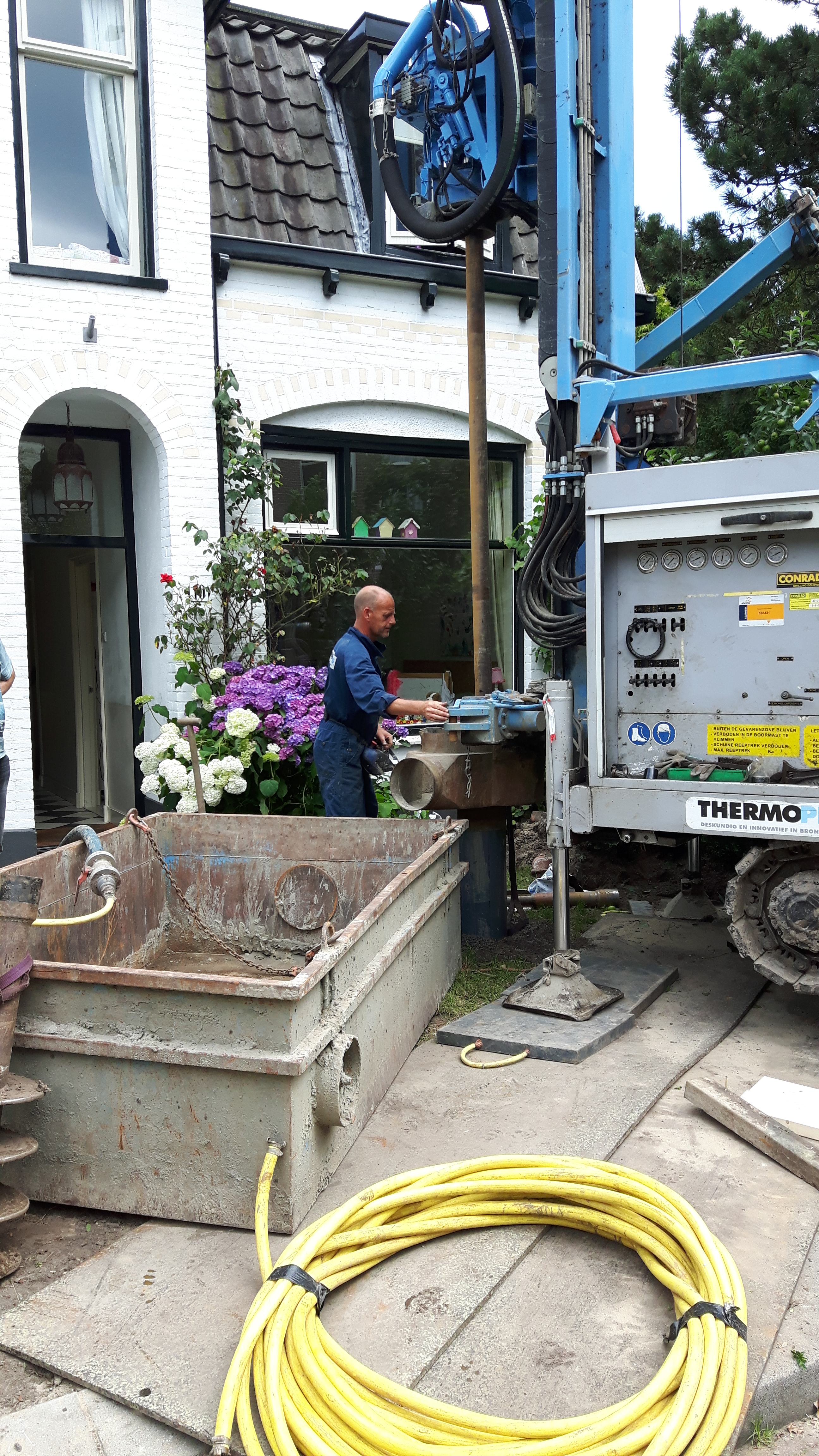 Dinsdag 28 juni is de bron geboord. Ondanks de krappe ruimte lukte het om de boormachine en de bak voor het spoelwater goed neer te zetten. De boor heeft een gat van 142,5 meter diep gemaakt, 126 meter door zand, daaronder door de klei. Er kwam zo’n 5 m3 grond uit het gat. Daarna is er een dubbele slang met een u-bocht onderin naar beneden gebracht. Dat moet snel gebeuren, want het gat vult zich langzaam op met zand. Om de slang goed te laten zakken was die vooraf gevuld met water en verzwaard met een aantal stalen cilinders. Uiteindelijk kwam de slang precies tot de geplande 140 meter diepte. Daarna werd het geboorde gat opgevuld met fijn grind. Na een nachtje inzakken kon de volgende ochtend de verbinding met de warmtepomp binnen worden gemaakt.